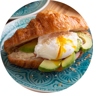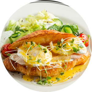 Ingredients: Fresh avocado, mix green veg, poached egg, turkey ham, Japanese mayo, hollandaise sauce.