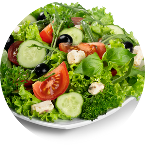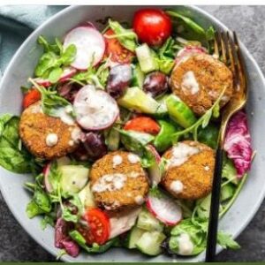 Ingredients: Mix Vegetables, Romaine lettuce, mix Cullin, wild rocket, purple cabbage, tomato slice, Cucumber slice, black olives, red radish, red onion, Fried Falafel, sumac.