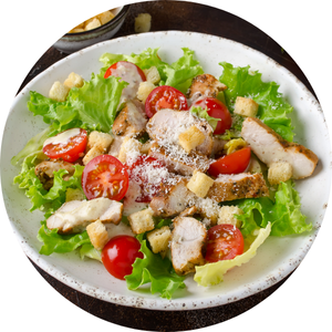 Ingredients; Fresh mix green veg, tomato, grilled chicken breast, garlic