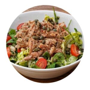 tuna chunks in oil, Rucola freshleaves,red radish baby, black olives,tomatoe cherry,olive oil,sweetcorn,capsicum(red/green/yellow), parsley fresh,mint leaves with lemon dressing