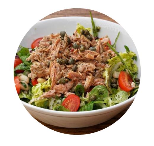 tuna chunks in oil, Rucola freshleaves,red radish baby, black olives,tomatoe cherry,olive oil,sweetcorn,capsicum(red/green/yellow), parsley fresh,mint leaves with lemon dressing