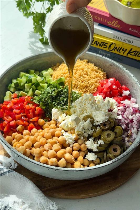 Ingredients ; Romaine Lettuce, White Onion, Tomatoes, cucumber, Olives, Bell Pepper, Feta Cheese, Egyptian Chickpeas, Organic Couscous, Mint Leaves , Salt, pepper, Lemon, Honey, Paprika, extra Virgin Olive oil.